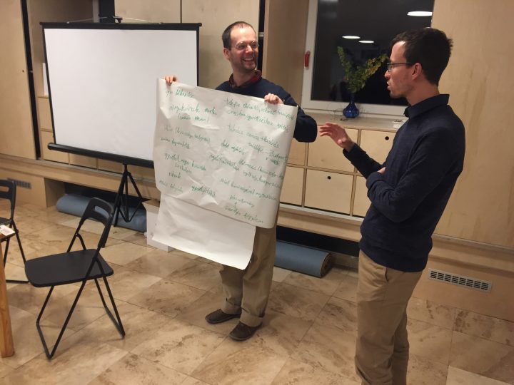 A kisebb körben mindenki bemutatkozhatott és pár szóval elmondhatta, hogyan, milyen érzésekkel, kérdésekkel érkezett. Aztán egy szociálpszichológiai játékban a saját bőrünkön kóstolhattuk meg, milyen tapasztalat lenne menekültként részt venni egy átlagos magyar csoport mindennapjaiban. Ezzel a játékos gyakorlattal igyekeztünk rávilágítani, hogy bár a mindennapokban elérendő céljaink látszólag ugyanazok, egy menekültnek mindezeket idegen nyelven, egy új kultúrába való beletanulás közben, idáig tartó útjának sebeit és traumáit hordozva kell teljesítenie, így mégis jóval nehezebb dolga van. És bár a magyar emberek között is sokan sokféle háttérből jövünk, különböző hiányosságokkal és nehezítő körülményekkel küzdünk, ebben a megküzdésben általában számíthatunk családtagjaink vagy barátaink segítségére.